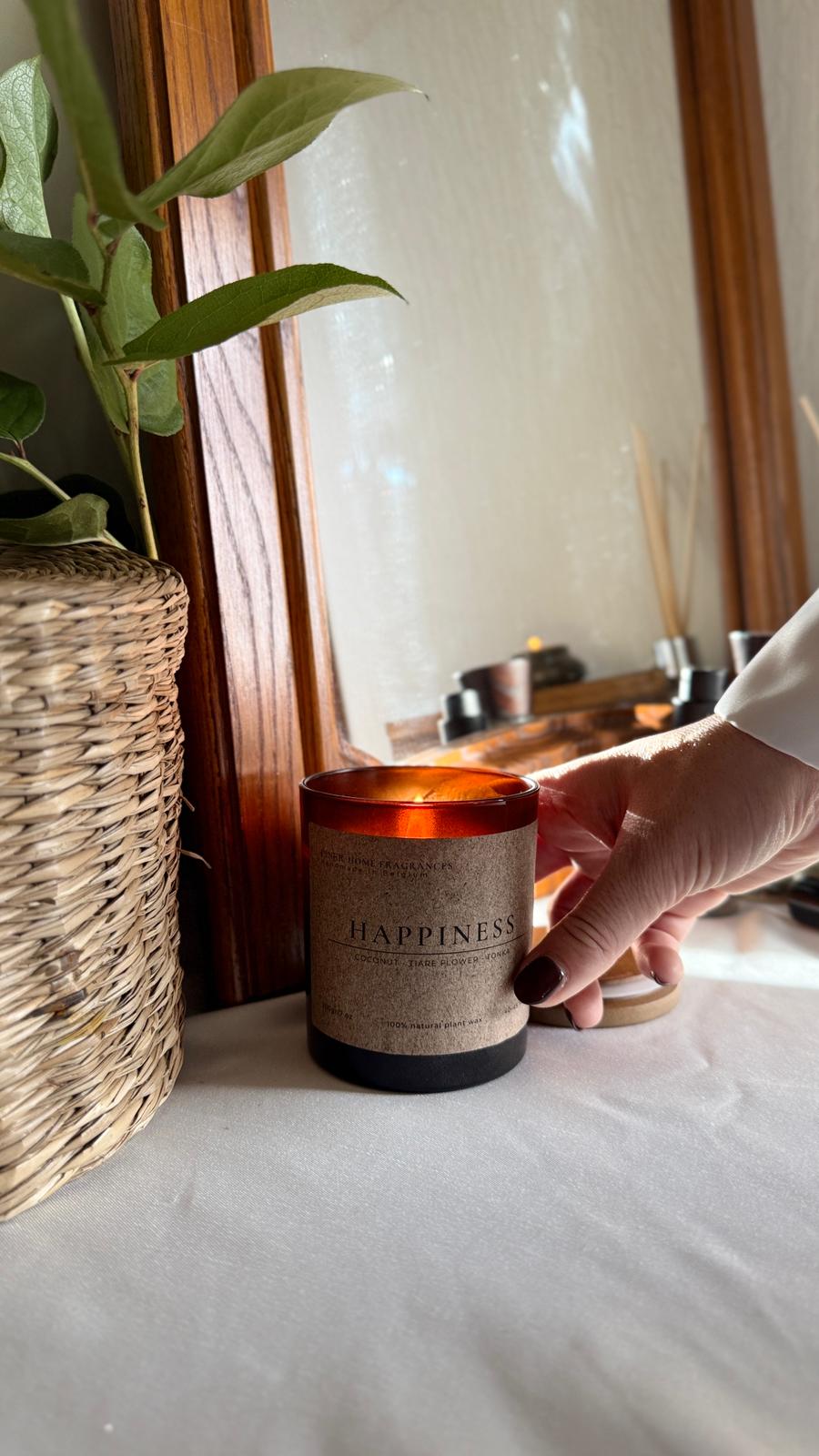 Neem jezelf mee op een reis naar puur geluk met onze Happiness geurkaars. Zonnige tonen van kokos, tiarébloem en vanille brengen licht en ontspanning in elke ruimte.